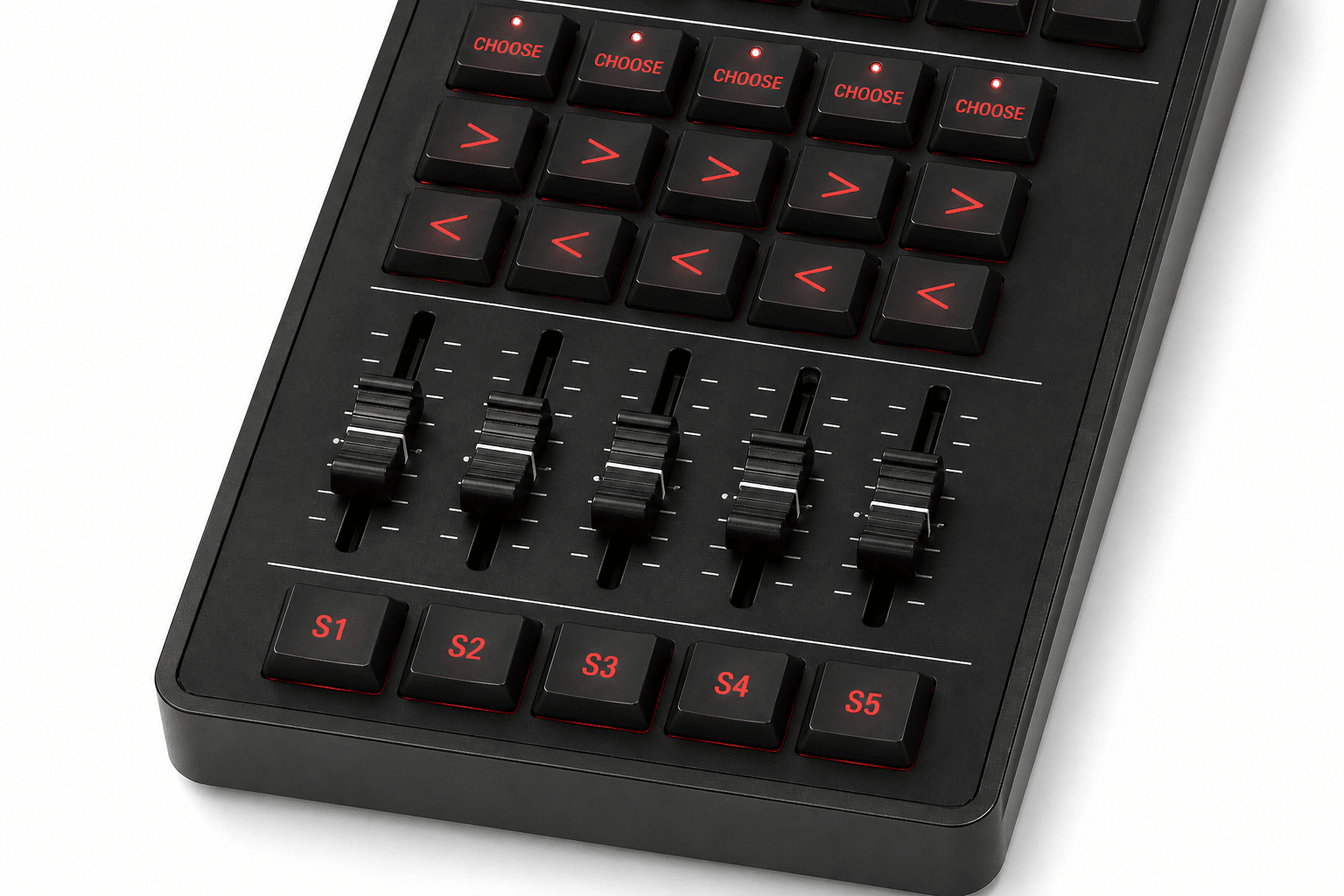 Faders de largo recorrido con knobs ergonómicos tipo consola para un control preciso de masters y playbacks.